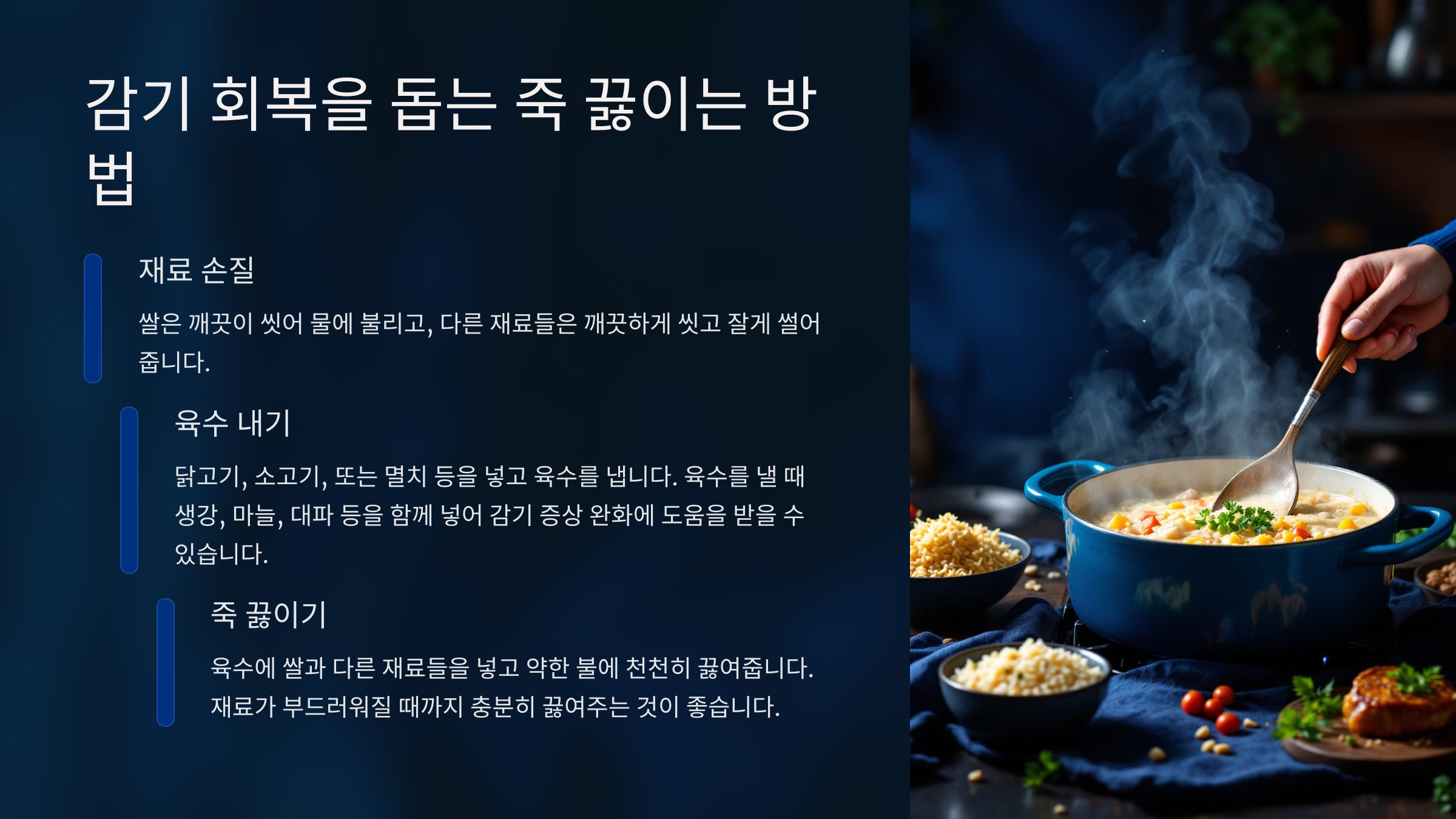 감기에 좋은 죽을 만들 때 중요한 것은 영양가가 풍부하고, 소화가 잘되며, 몸을 따뜻하게 해주는 재료를 활용하는 것이에요. 아래 5가지 죽 레시피는 감기 회복을 돕는 데 효과적인 음식들이에요.