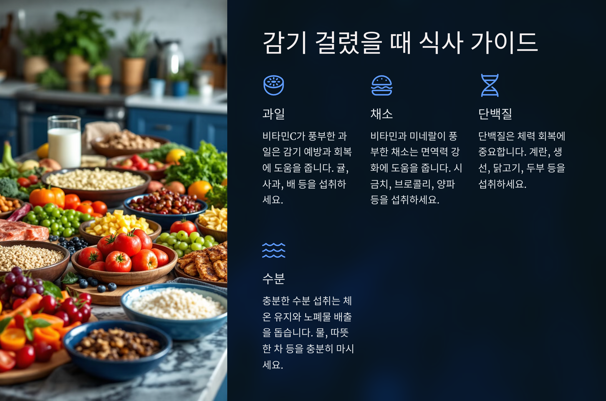 감기에 걸렸을 때는 죽뿐만 아니라 다양한 영양소를 균형 있게 섭취하는 것이 중요해요. 아래 가이드를 참고해 감기 회복을 돕는 식사를 해보세요.