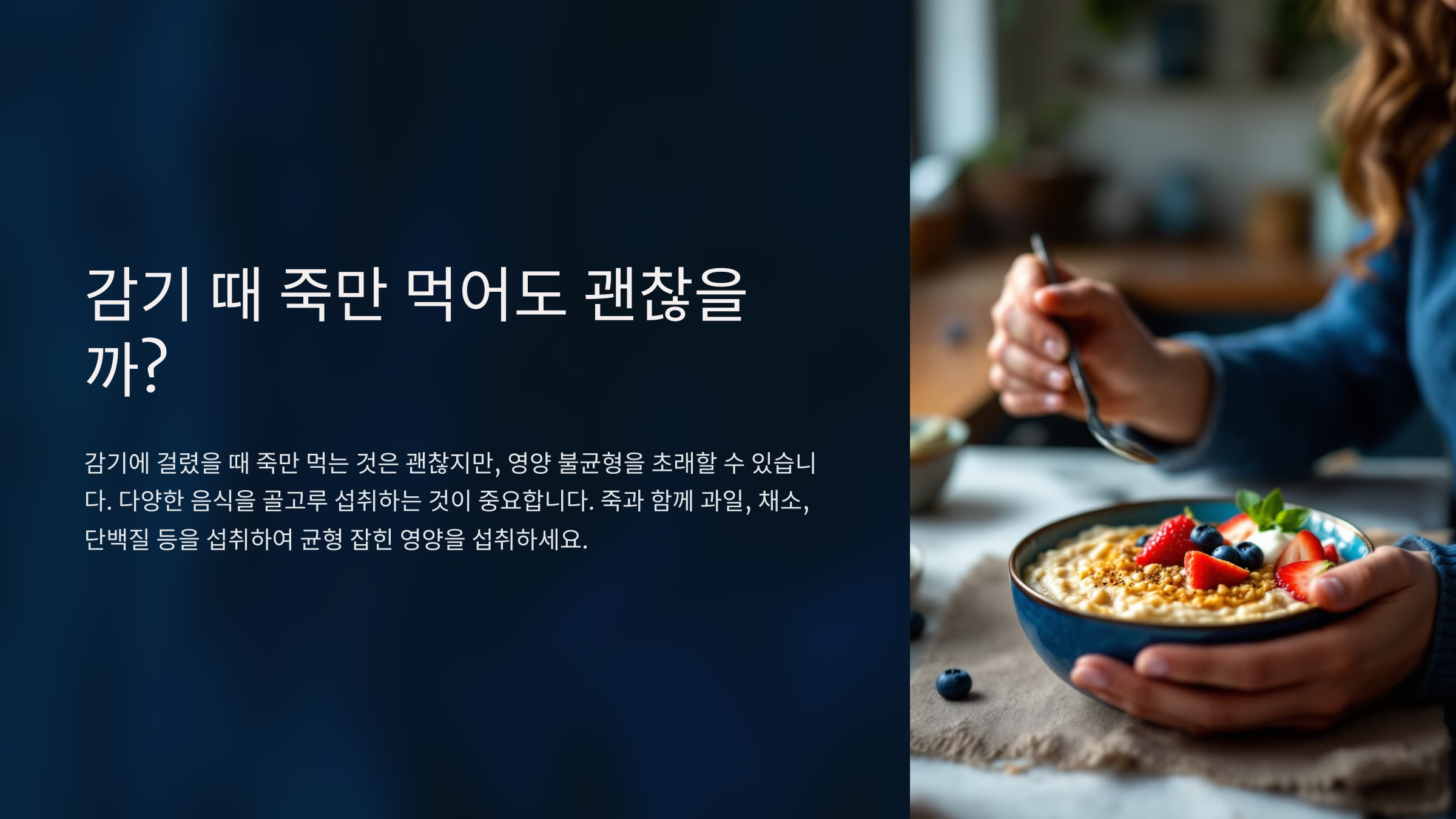 죽만 먹기보다는 단백질과 비타민이 풍부한 음식을 함께 섭취하면 감기 회복 속도가 빨라져요.