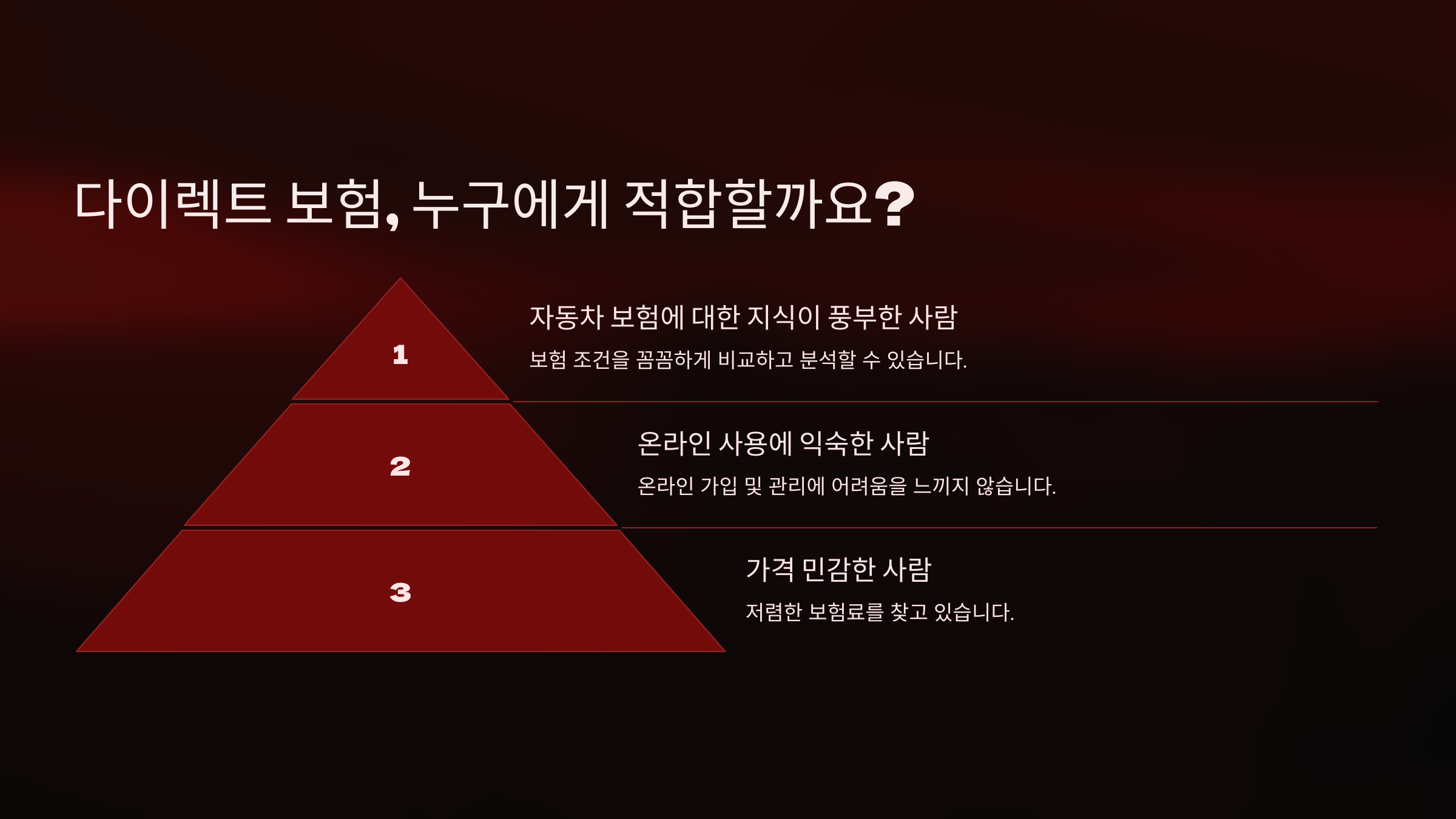 다이렉트 보험은 주로 비용 효율성을 중요시하는 사람들에게 적합해요. 특히, 자동차를 구매한 후 처음 보험에 가입하는 젊은 운전자나 사고 위험이 낮은 운전 경력자를 위한 선택지로 추천됩니다.