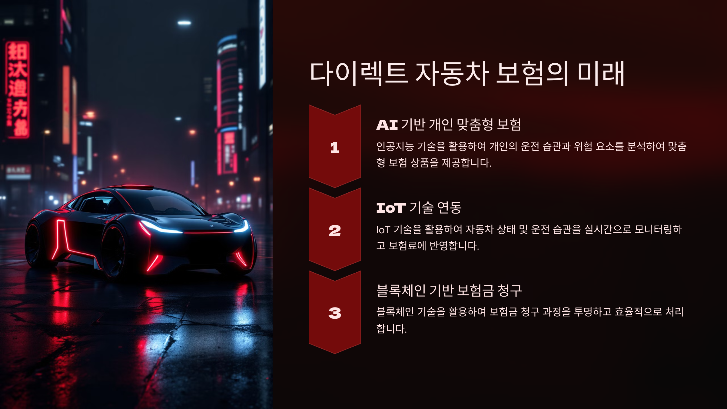 다이렉트 자동차 보험은 기술 발전과 함께 빠르게 성장할 가능성이 높아요. 특히, 인공지능(AI)과 빅데이터를 활용한 맞춤형 보험 상품 설계가 주요 트렌드로 자리 잡고 있어요.