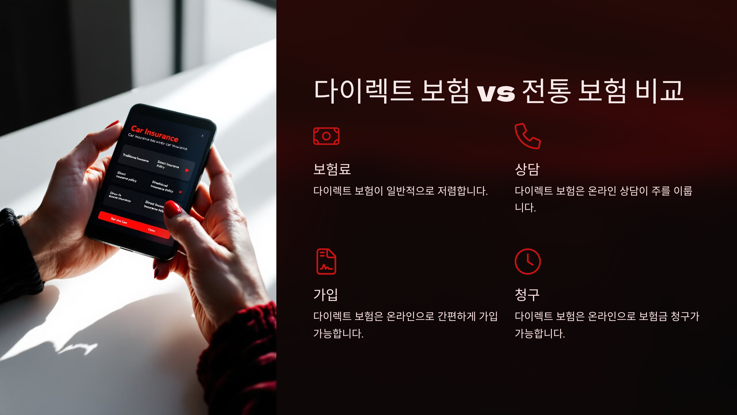 다이렉트 보험과 전통 보험의 가장 큰 차이점은 비용과 편의성이에요. 다이렉트 보험은 중개 수수료가 없기 때문에 같은 조건이라면 대체로 저렴한 가격을 제공합니다. 반면, 전통 보험은 설계사와의 대면 상담이 가능해요. 이로 인해 복잡한 상황에서도 도움을 받을 수 있는 장점이 있죠.