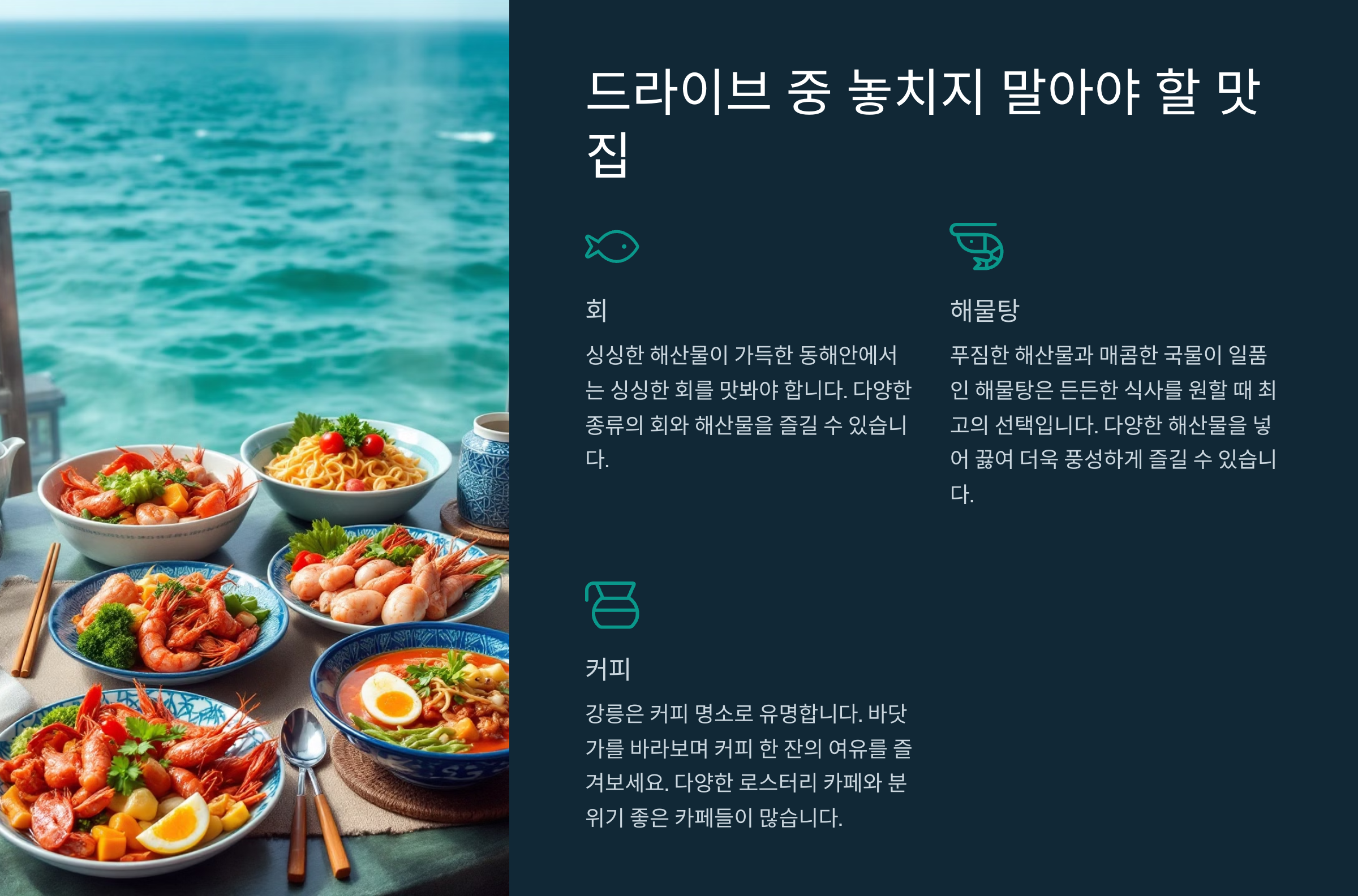 Q5. 동해안 드라이브 중 꼭 먹어야 할 음식은 무엇인가요?