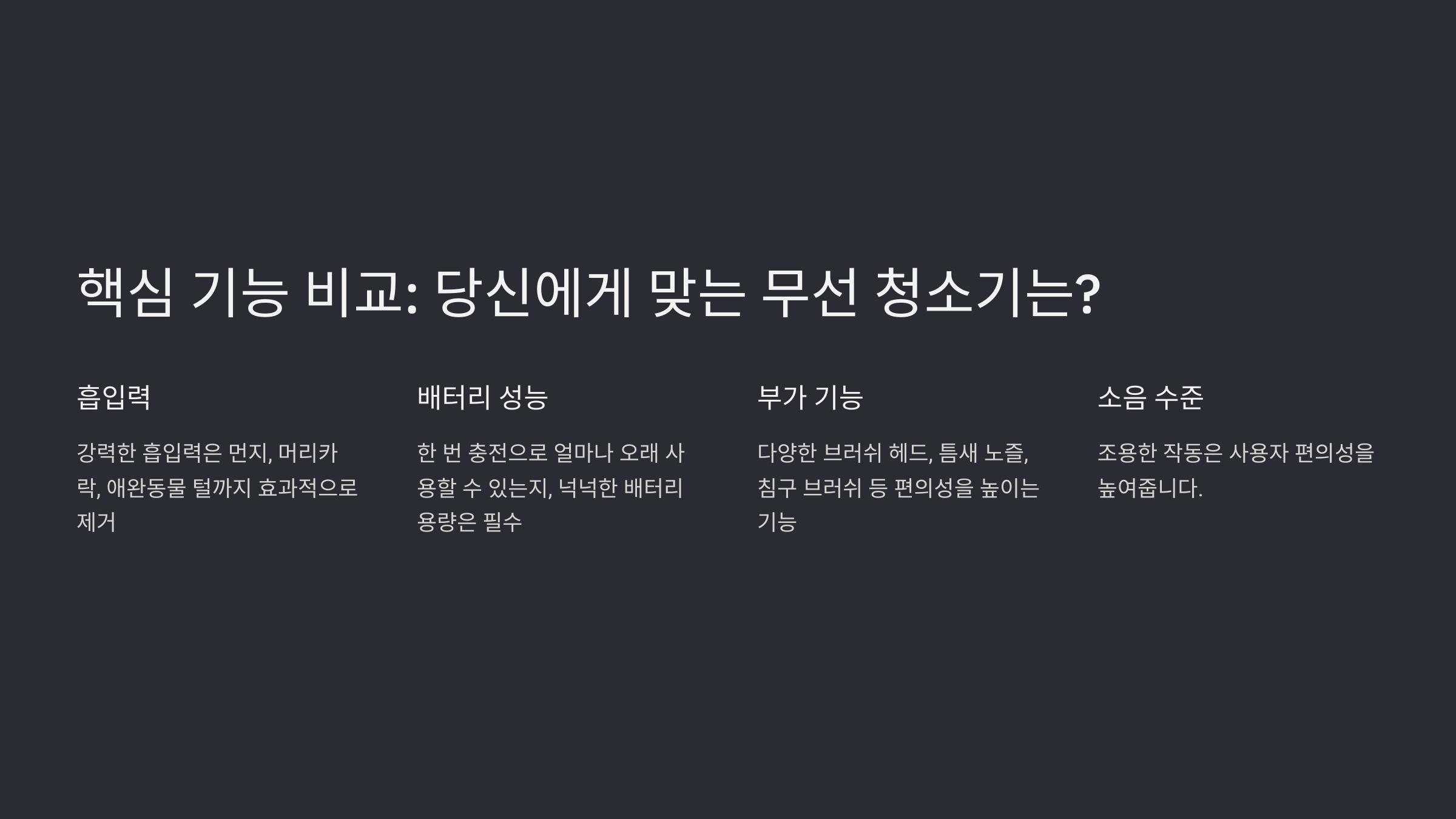 무선 청소기를 선택할 때 가장 중요한 요소는 흡입력, 무게, 필터 성능, 사용 시간 등이에요. 브랜드마다 강점이 다르기 때문에 자신에게 맞는 제품을 선택하는 게 중요해요.
