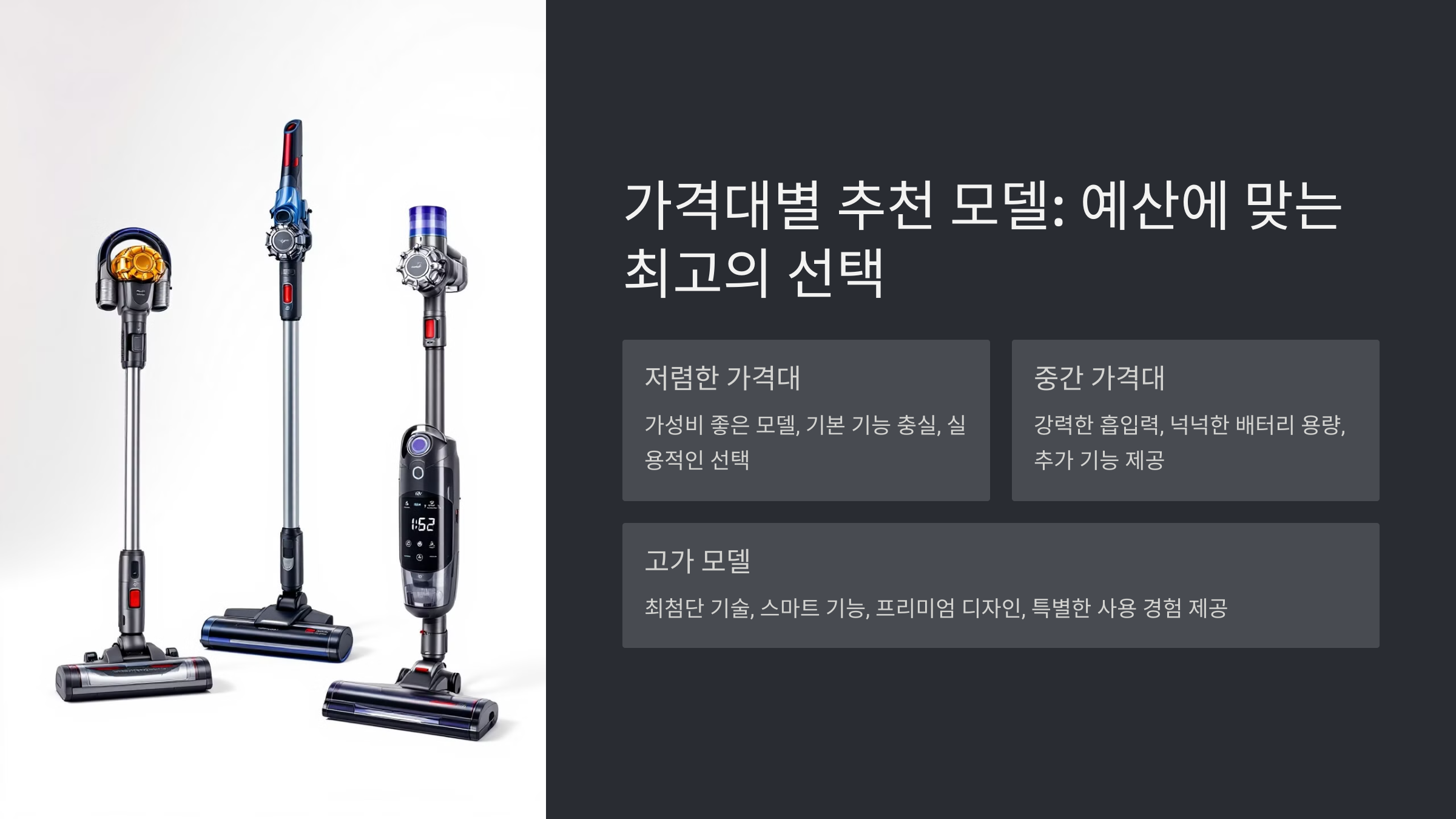30만 원 이하 제품은 가성비가 뛰어나지만, 배터리 성능이 조금 아쉬울 수 있어요. 중급형 모델은 가격 대비 성능이 우수하고, 프리미엄 모델은 강력한 흡입력과 스마트 기능이 추가된 점이 특징이에요.