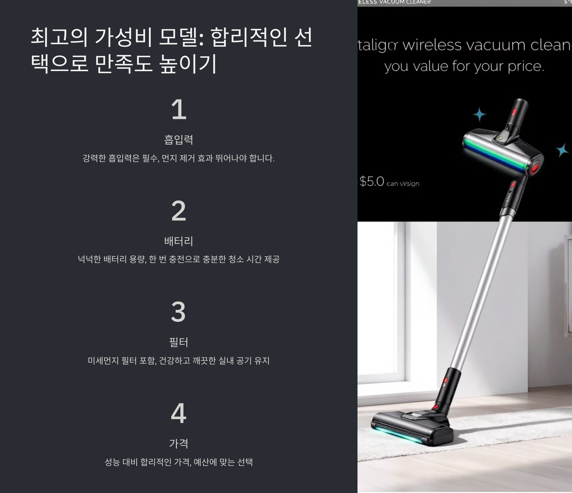 가성비 모델을 선정할 때 가장 중요한 기준은 **가격 대비 성능**이에요. 흡입력, 사용 시간, 필터 성능을 고려하면서도 가격이 합리적인 제품이 최적의 선택이겠죠.