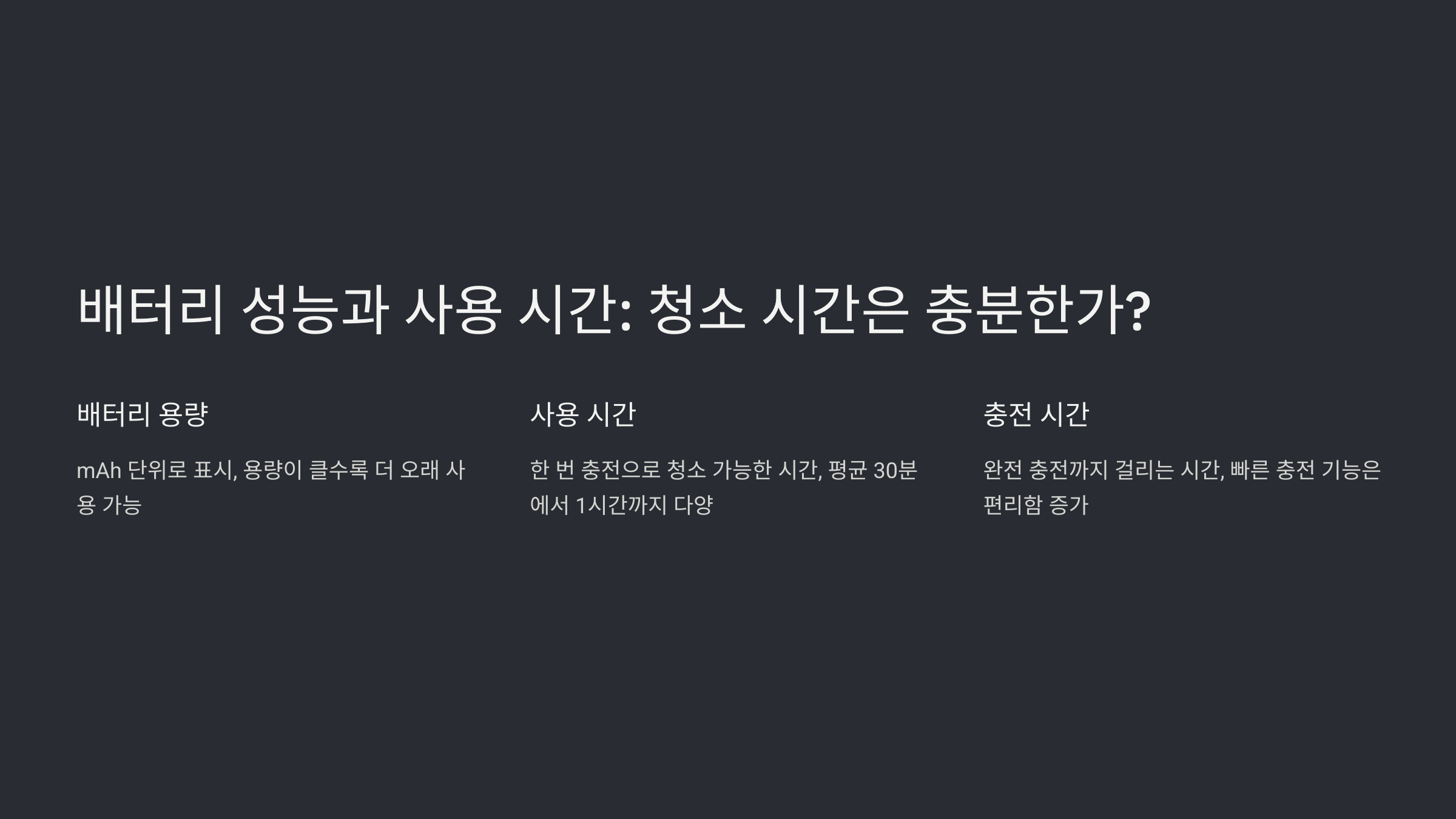 무선 청소기의 핵심 요소 중 하나가 **배터리 성능**이에요. 아무리 흡입력이 강해도 사용 시간이 짧으면 불편하겠죠? 🤔