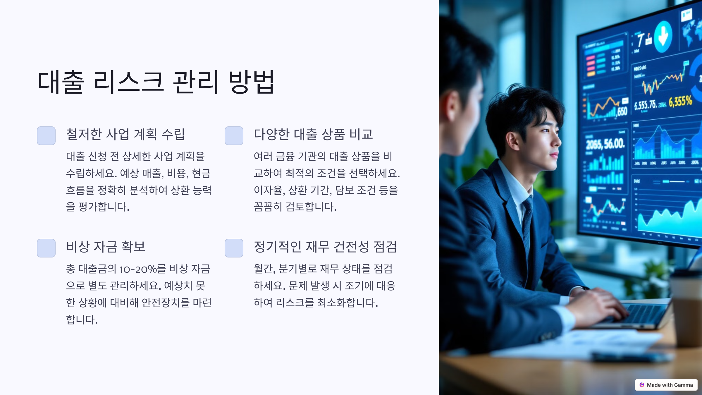 리스크 관리는 단순히 문제를 예방하는 것뿐만 아니라, 사업 성장의 기반을 다지는 과정이에요. 안정적인 상환과 지속적인 성장은 결국 신뢰를 쌓는 데 큰 역할을 하게 돼요.