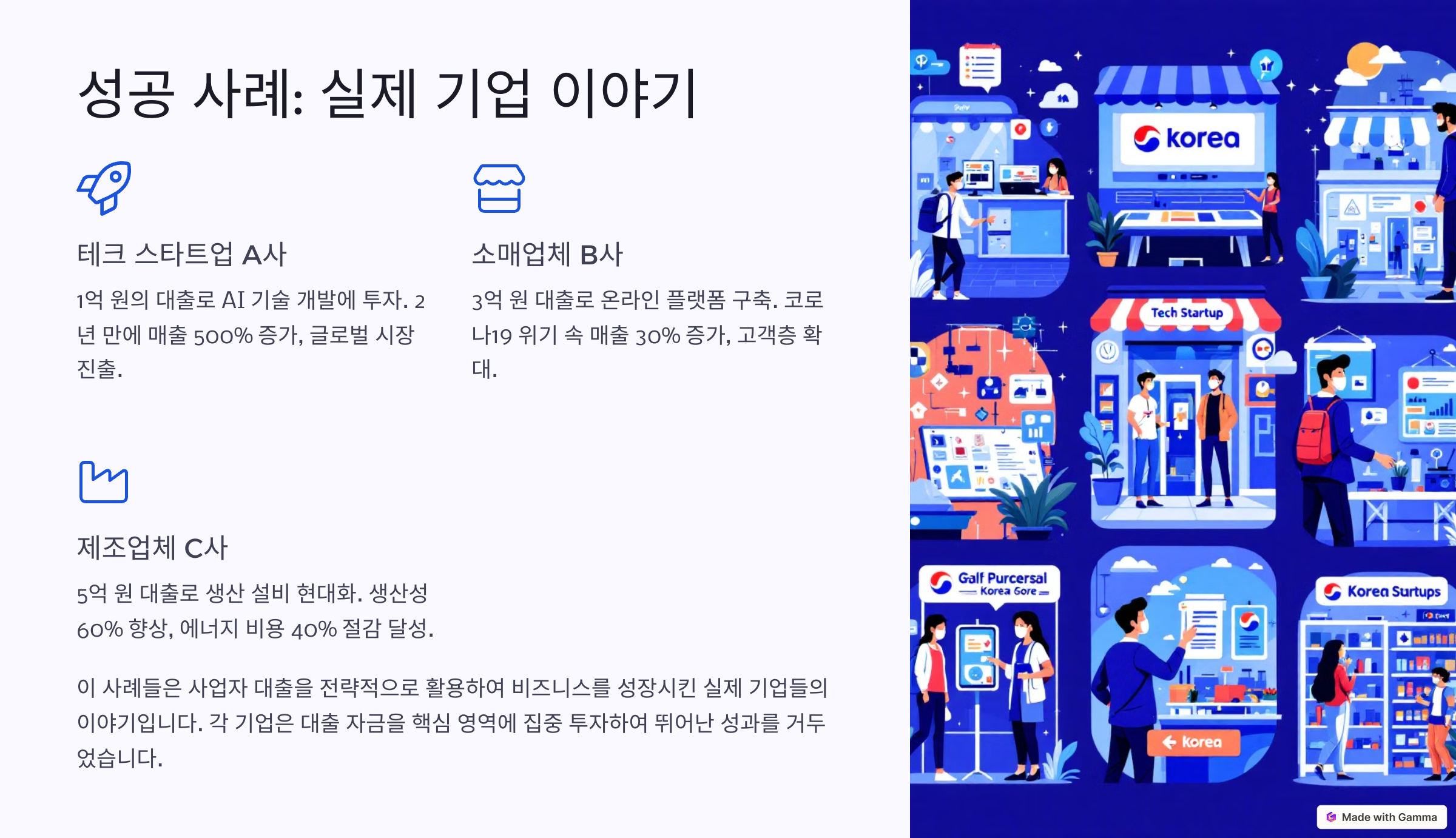 A사의 대표는 "대출을 전략적으로 활용한 덕분에 안정적인 매출 기반을 구축할 수 있었다"라고 말했어요. 이 사례는 대출 자금을 단순히 사업 운영에 쓰는 것이 아니라, 명확한 목표와 계획을 가지고 투자했을 때 어떤 성과를 낼 수 있는지를 잘 보여줘요.