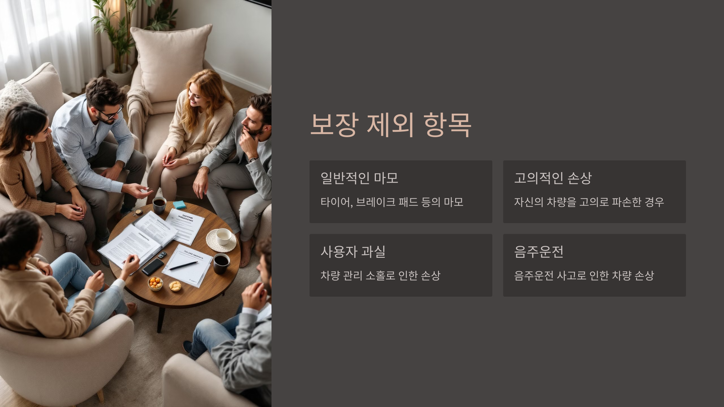 A7. 아니요, 음주운전, 고의 사고, 불법 개조 등은 보장에서 제외돼요. 약관을 꼼꼼히 확인하는 것이 중요해요.