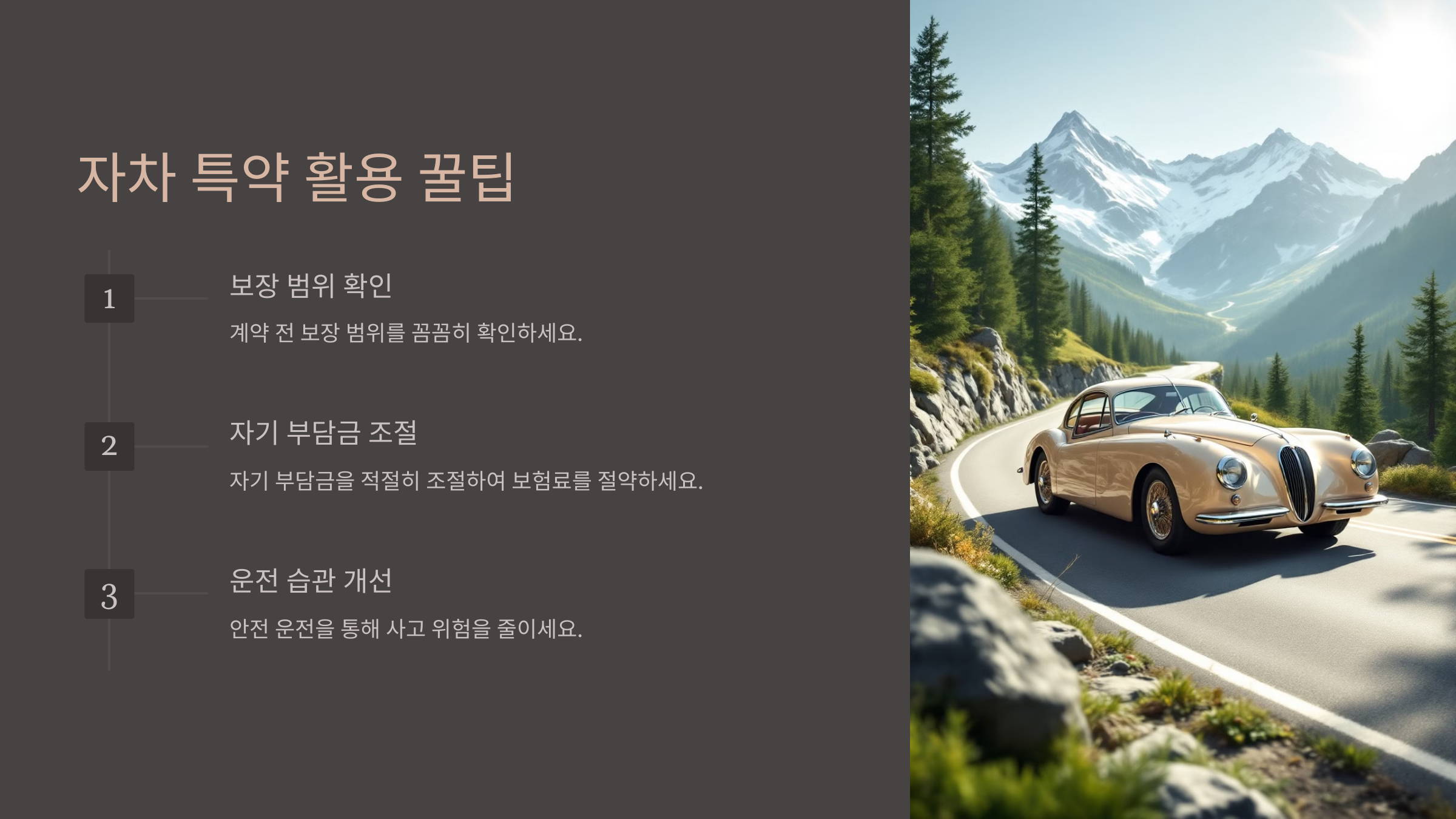 넷째, 보험 갱신 시 보장 내용과 특약을 재검토하세요. 차량의 상태나 운전 습관이 변했을 경우, 기존 자차 특약이 적합하지 않을 수 있어요. 갱신 시점에 새로운 상품을 비교하고 최적의 조건으로 변경하는 것이 현명한 방법이에요.