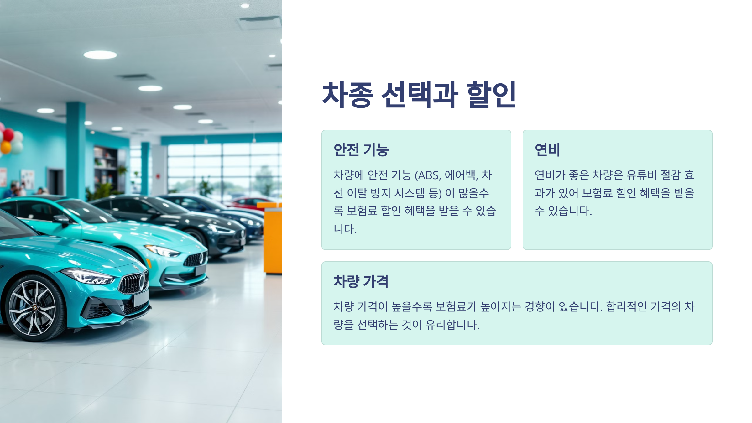 자동차 보험료는 차량의 종류, 연식, 배기량 등에 따라 달라져요. 특히 차량이 안전장치를 얼마나 잘 갖추고 있는지가 보험료에 큰 영향을 미쳐요. 예를 들어, 에어백이나 첨단 운전자 지원 시스템(ADAS)이 장착된 차량은 사고 위험이 낮아 보험료가 상대적으로 저렴할 수 있어요.