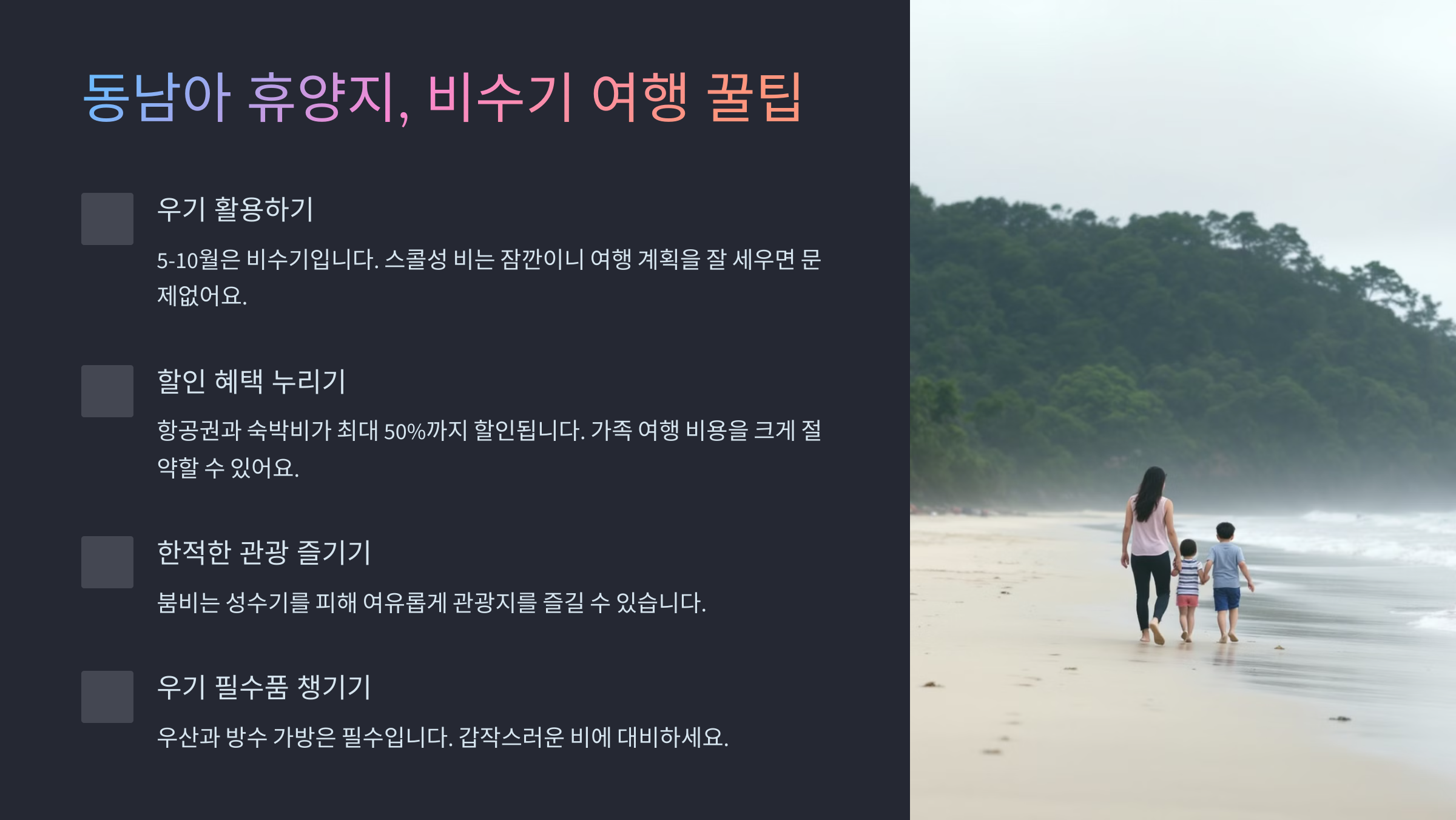 🚀 이어서 동남아 휴양지, 비수기 여행 꿀팁을 알려드릴게요!