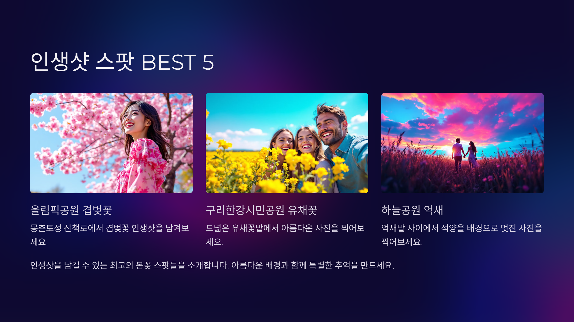 이곳에서는 가족, 연인, 친구들과 함께 봄나들이를 즐기며 인생샷도 남길 수 있어요. 각 명소마다 꽃이 피는 시기와 특징이 다르니 잘 알아보고 방문하는 게 좋아요.