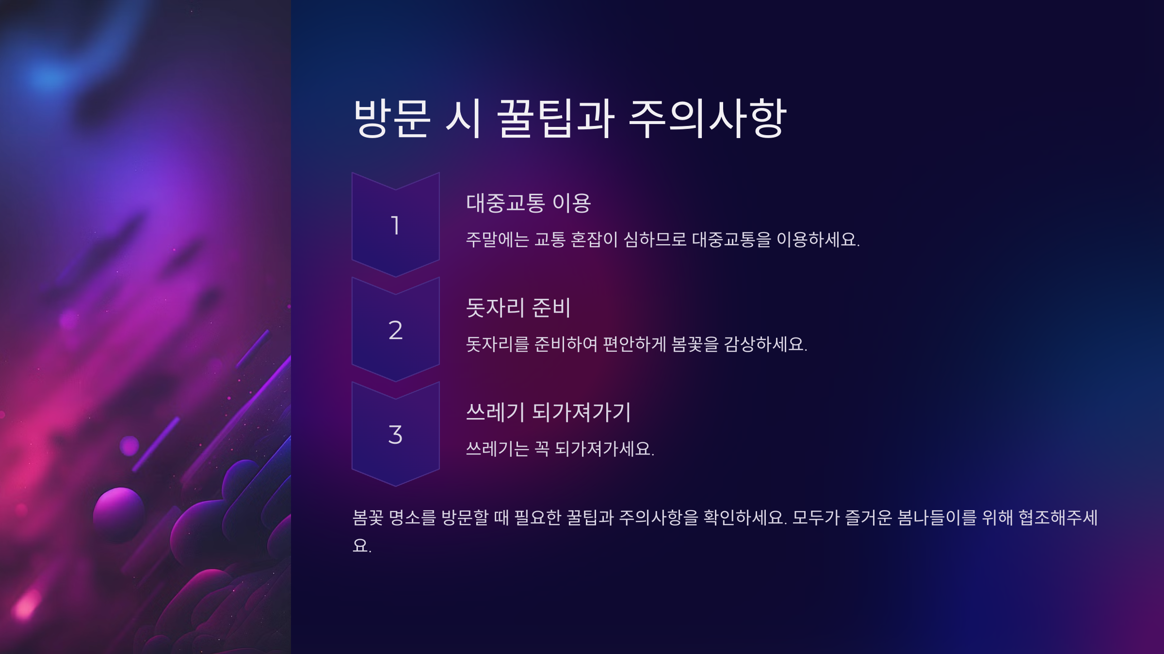 봄꽃 명소를 더욱 알차게 즐기려면 몇 가지 꿀팁과 주의사항을 알고 가면 좋아요. 😊🌸