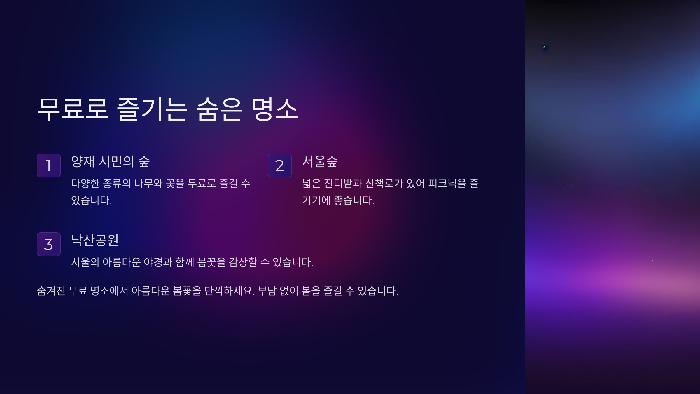 비용 없이도 아름다운 봄꽃을 즐길 수 있는 숨은 명소들이 많아요. 특히 서울과 수도권에는 무료로 개방된 공원과 산책로가 많답니다. 🌿
